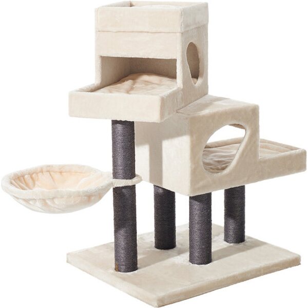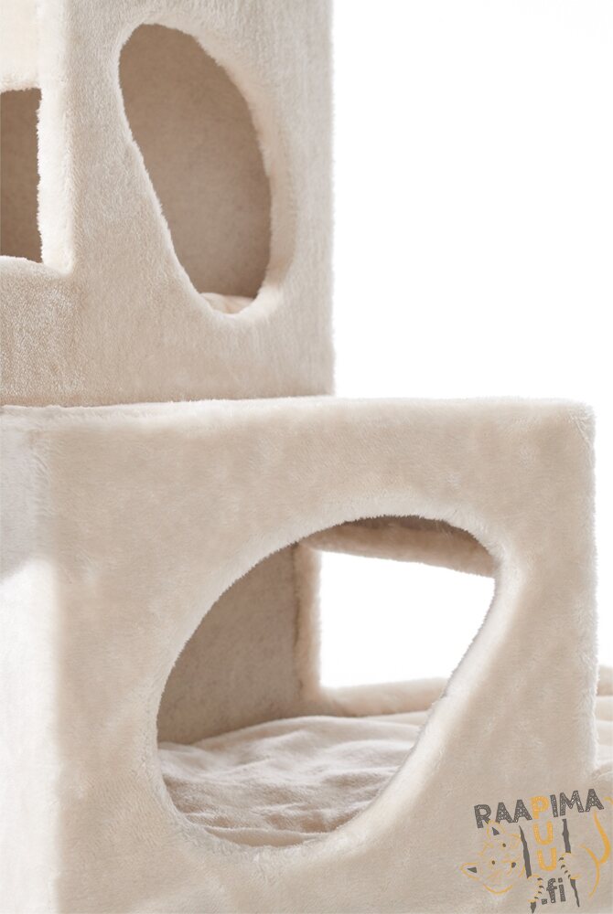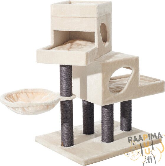 Puun pehmeä tyyny ja lämmin pesäkolo tarjoavat täydellisen paikan päiväunille, kun taas rungon ympärille kiedottu sisal-köysi toimii tehokkaana raapimispintana – ihanteellinen kissan kynsien kunnossapitoon. Hillitty vaalea kermanväri yhdistettynä harmaaseen sulautuu kauniisti kaikenlaiseen sisustukseen.